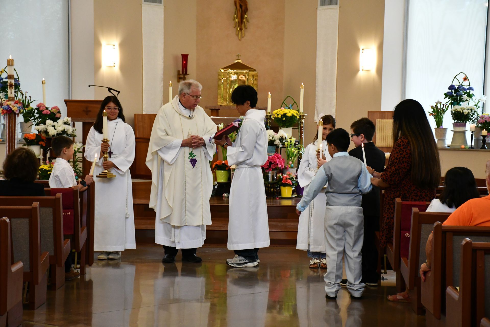 Boys and girls of the parish assist at a variety of liturgical events including Sunday and Holy Day celebrations of the Eucharist. Special skills: Servers must be conscientious, reverent, attentive, punctual and well behaved. Training & regular renewal sessions required. Children must be in the 3rd grade and have received First Communion. Adults are welcome to be trained as well. Time commitment is once or twice a month. Scheduling requests must go through parish office.